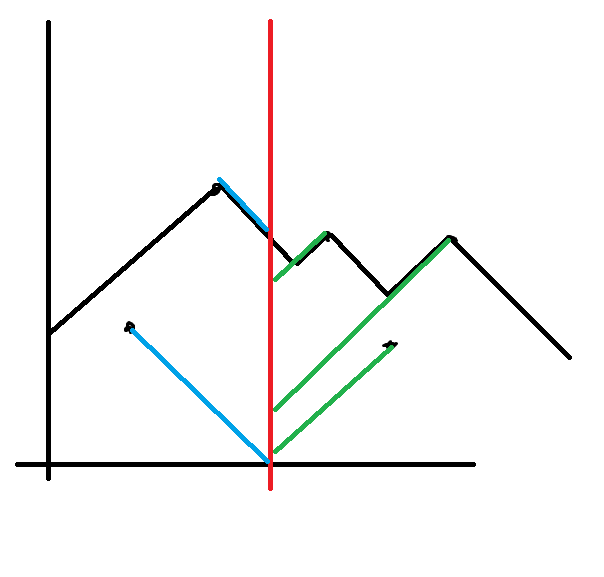 일단 $x=l_i$의 직선을 그리고 생각해보자. 직선 왼쪽에 있는 점들은 직선으로 기울기가 -1인 직선(파란색)을 긋고, 직선 오른쪽에 있는 점들은 기울기가 1인 직선(초록색)을 그리자. 그러면 그 직선들과 빨간 직선의 교점들중 가장 높이 있는것이 불편도가 된다. 이를 어떻게 알까? 우선, 한 점에서 이은 파란선과 빨간선의 교점은 x, y좌표의 합과 관련이 있고, 초록선은 차($|x-y|$가 아닌 $x-y$)와 관련이 있다. 따라서 우리는 각 점에 대해 좌표의 합과 차를 저장하고, $x$좌표가 $x_{l_i}$이상의 점들에 대해 좌표의 합의 최대, $x$좌표가 $x_{l_i}$이하의 점들에 대해 좌표의 차의 최대를 관리해주면 된다. 이는 한번의 시뮬레이션을 해 각 시점에 극대점들이 어떻게 추가되고 삭제되는지 전처리하고 쿼리를 해결할 때에는 특정 구간에 있는 유효한(각 시점에서 존재하는) 정점에 대해 좌표의 합과 차의 최대, 최소를 세그먼트 트리로 관리하는 방식으로 풀면 된다.